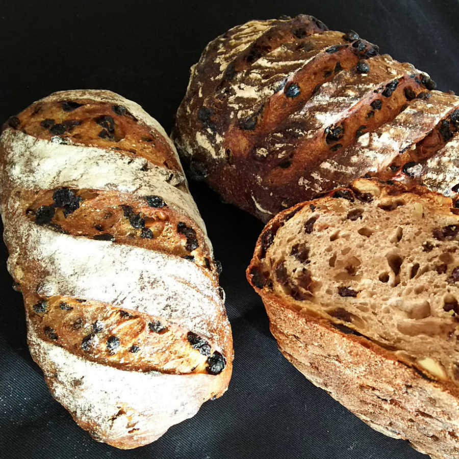 自家製天然酵母で発酵させたパン。赤ワインに漬け込んだカレンズ(山ぶどう)と、ローストしたくるみがぎっしり。 チーズとの相性がいい。