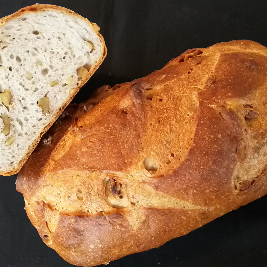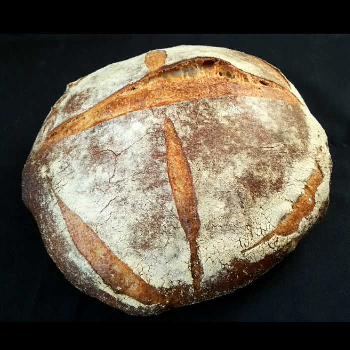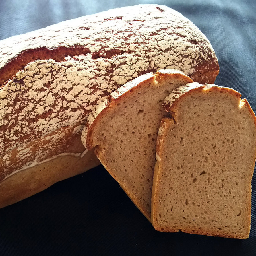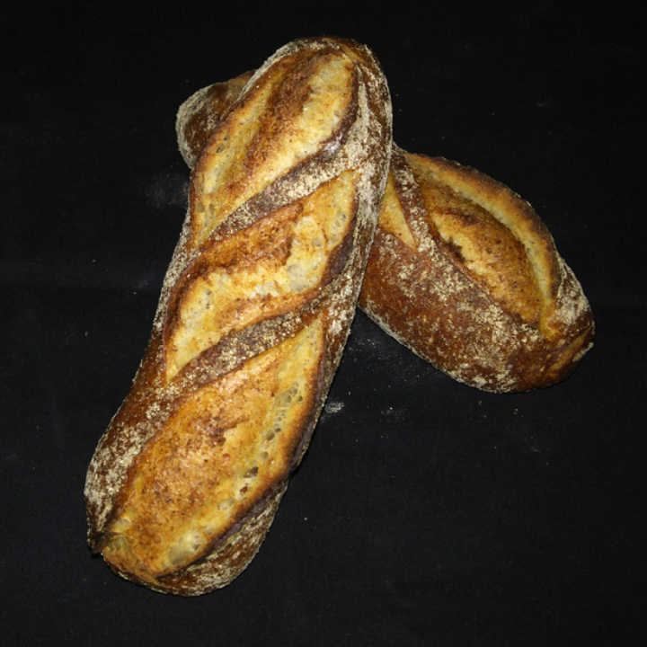 自家製天然酵母で発酵させたガシッとしっかり固いパンです。薄くスライスして、酸味と香ばしさを感じてください。カナッペなどにも最適。以前、雑誌「料理王国」で最高の評価を頂いたパンです!