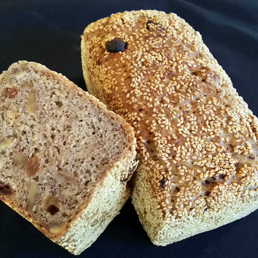 フロッケン(押麦)入りライ麦パン。白ぶどうのレーズン、ローストしたくるみが入ってまわりには、白ゴマが付いてます。 薄くスライスしてどうぞ。