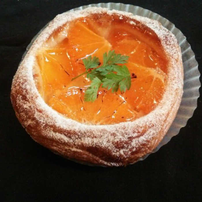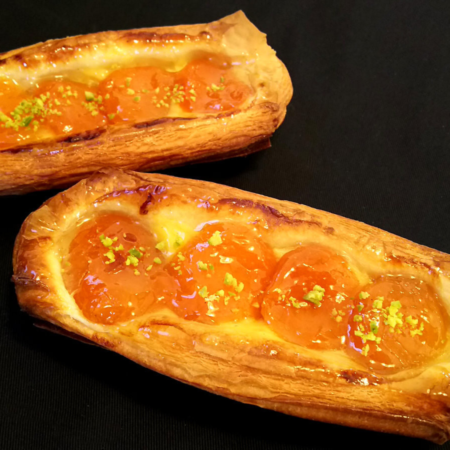 サクサクデニッシュ生地に、はちみつしょうがのシロップで煮込んだあんずが、スポンジ、自家製カスタードクリームとともに のってます。ほどよい酸味をお楽しみ下さい。