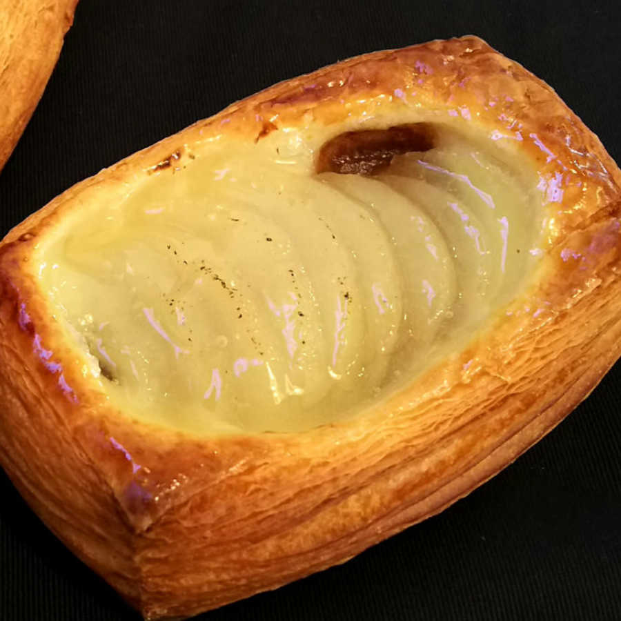 サックサクのデニッシュ生地に、白ワインで煮た洋梨。中にチョコと自家製カスタードクリームが入ってます。 チョコと洋梨とサクサクデニッシュの相性が抜群。
