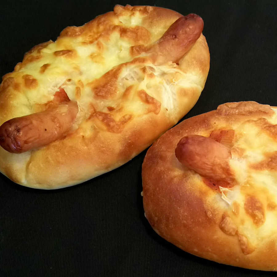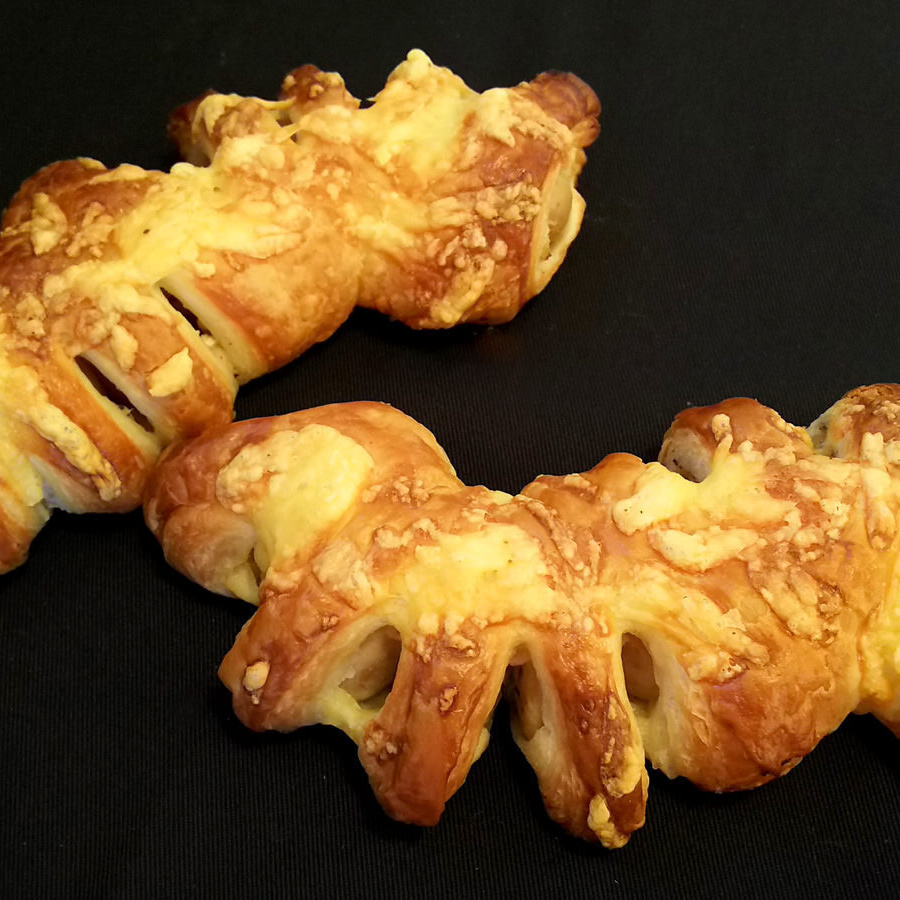 デニッシュ生地に丸ごとハーブソーセージと、サワークリーム、ザワークラウト(キャベツの酢漬け) 黒こしょうが入っています。上にはゴーダチーズ