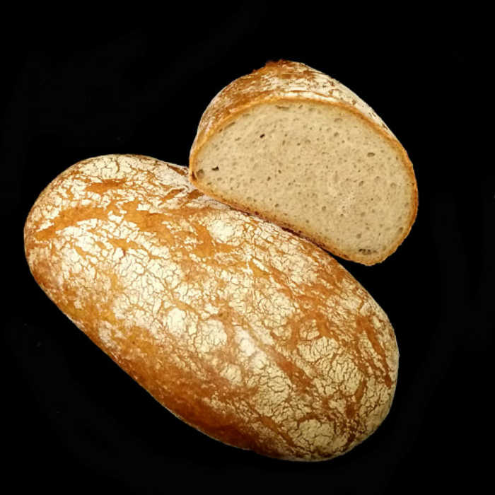 自家製天然酵母で発酵させたガシッとしっかり固いパンです。薄くスライスして、酸味と香ばしさを感じてください。カナッペなどにも最適。以前、雑誌「料理王国」で最高の評価を頂いたパンです!